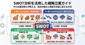 「うちの商品にはライバルがいません」は危険信号です。間接的な競合も含め、客観的に自社の強みと弱み(SWOT分析)を把握しているかを見られます。